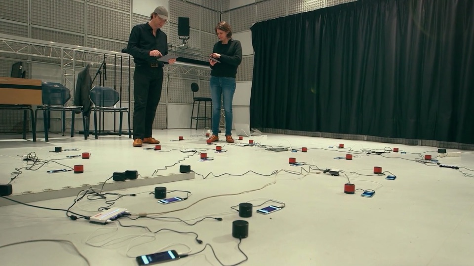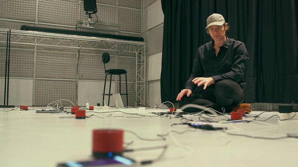 Collective Loops is shown in a reduced version with eight smartphones mounted on desk and a screen that replaces the floor projection.