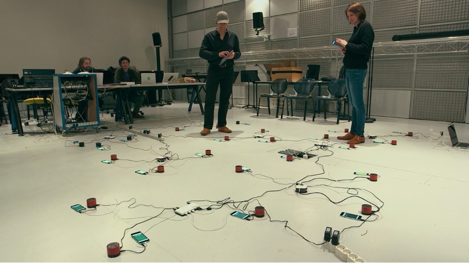 Listening with headphones, each player embodies a single track of the mix controlled through the device’s inclination. Approaching one another, the sounds blend to a commun mix in the player’s earphones. Wandering about, each player’s mix evolves according to a unique trajectory through the encounters and interactions with others.