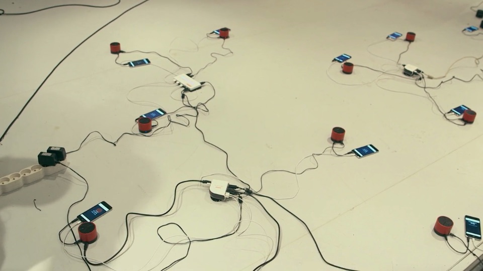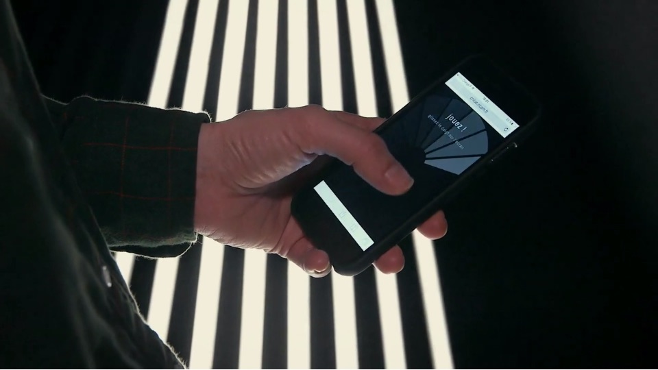The installation that refers to the participative concert we created with Chloé, is based on the same technical setup and music track as the Terminal installation and features 14 wall mounted smartphones. As in the concert and the Terminal installation, the public can connect to the installation to participate using their mobile devices.