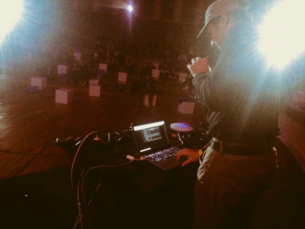 The sound generated by the participants creates a sound textures distributed over the audience. The current weather states of all clients are collected on the server to generate a weather profile that controls visuals on a public display and environmental sounds on the PA. In addition, the weather profile is interpreted by a DJ playing live electronic music in dialog with the audience’s sound textures.