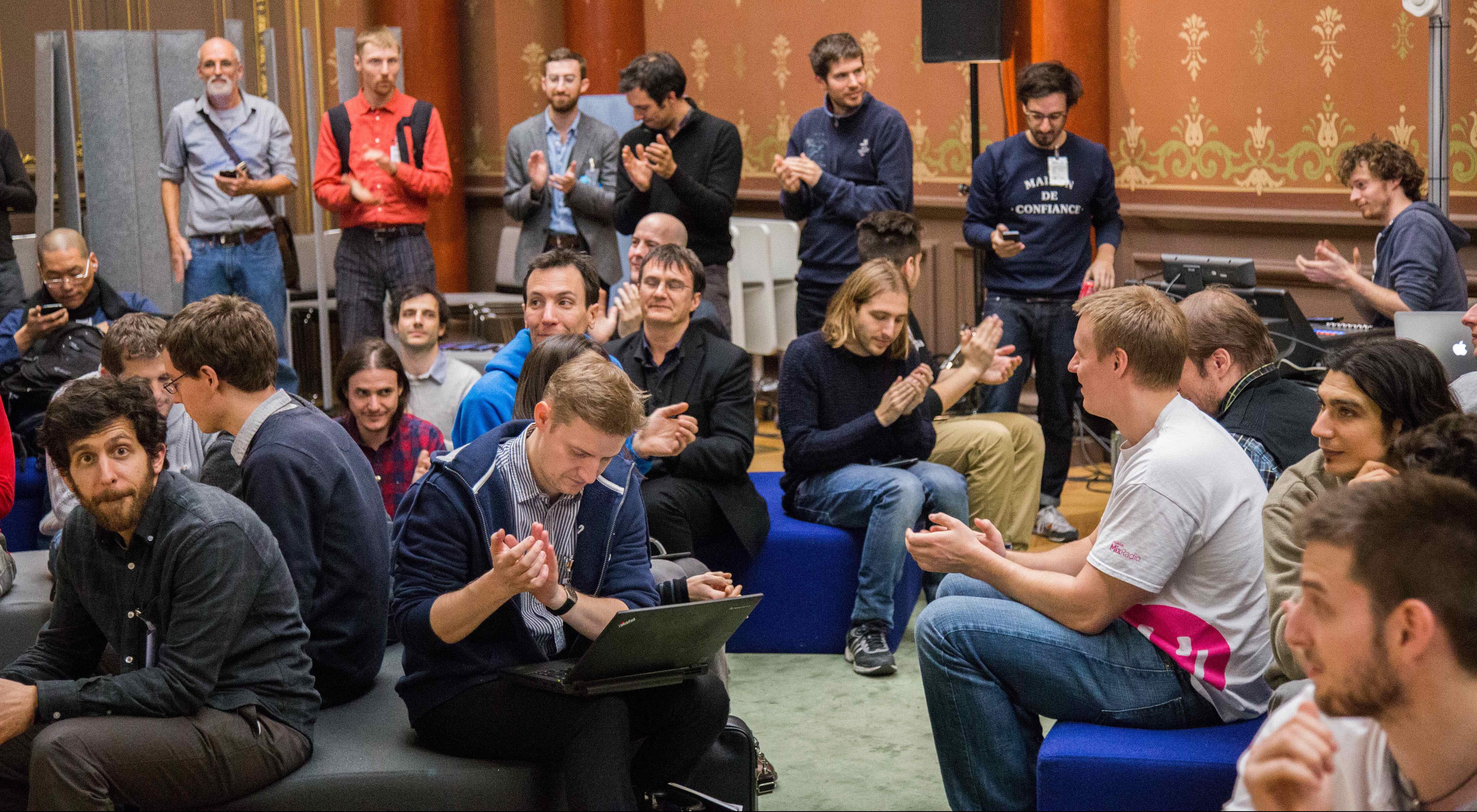 Finally, we presented the first public representation of Drops, a collective smartphone performance built with Soundworks. Drops is strongly inspired by the mobile application Bloom by Brian Eno and and Peter Chilvers, and transposes it into a collaborative experience: each participant can only play a single sound (i.e. a single pitch), whose timbre can vary depending on the touch position. Together, the players can construct sound sequences (i.e. melodies) by combining their sounds. The sounds are repeated in a fading loop every few seconds until they vanish. Players can clear the loop by shaking their smartphones. The sounds triggered by one player are automatically echoed by the smartphones of other players. The collective performance on the smartphones is accompanied by a synchronized soundscape on ambient loudspeakers. This first Drops representation gathered around 60 players at the WAC.