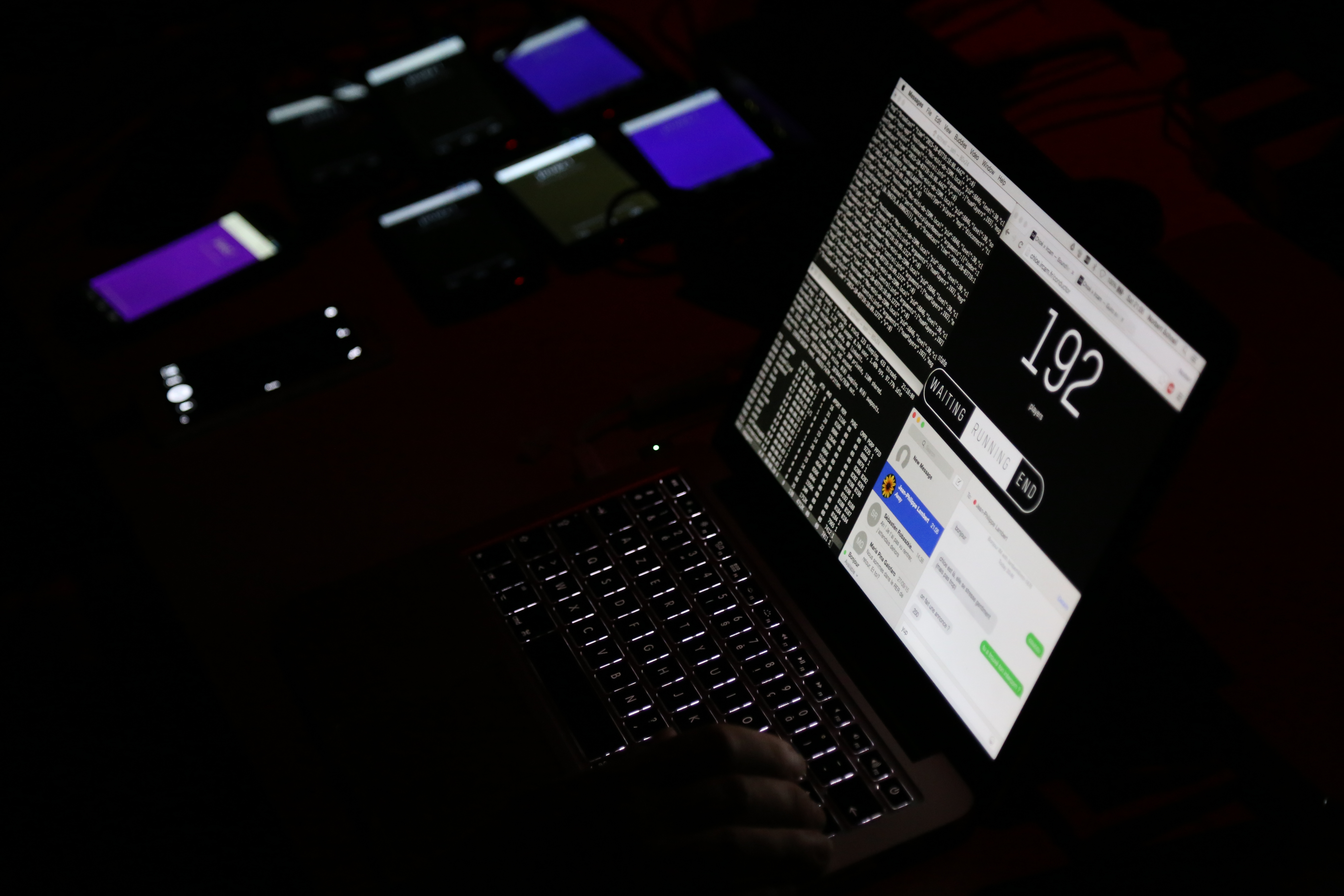 Like at the Fete de la musique, the audience participates in this concert by connecting their smartphones to the local Wi-Fi network Chloe × Ircam and by opening the web page chloe.ircam.fr in their browser. Once connected, the participants are asked to indicate their approximate position on map of the concert space. During the concert, Chloé can move sounds over the audience’s smartphones – using four tablets integrated into her setting – and let appear dedicated sound interfaces on the touchscreens. The concert starts and ends with everybody playing with Chloé’s whispering voice.