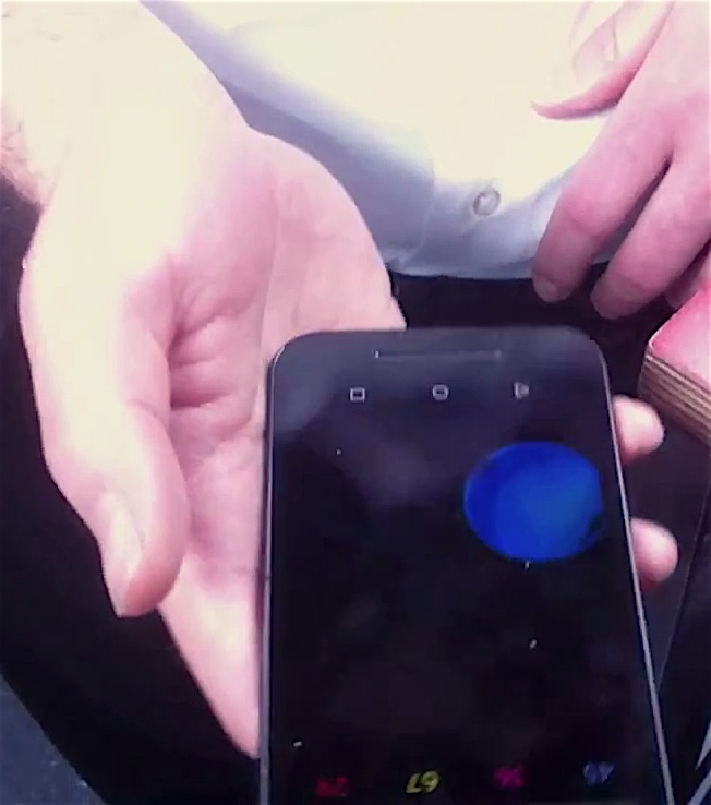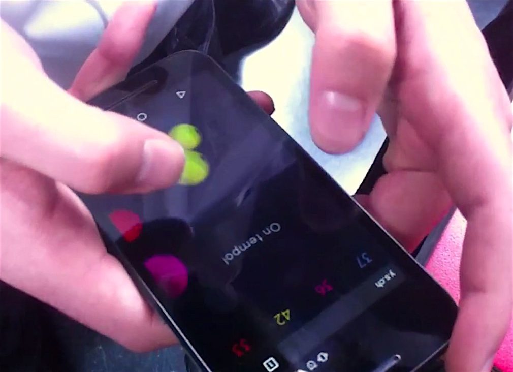In GrainField the smartphones enable the participants to play with the granular synthesis of 2 secs of sound recorded from a percussionist sitting in the middle of the audience (see images below). The system records every second 2 secs of sound that are send to the smartphones of the audience so that the sound a participant plays with changes every 8 seconds. The sound generated by the participant’s smartphones can be perceived as a distributed granular echo of the percussionist’s performance without any other amplification.