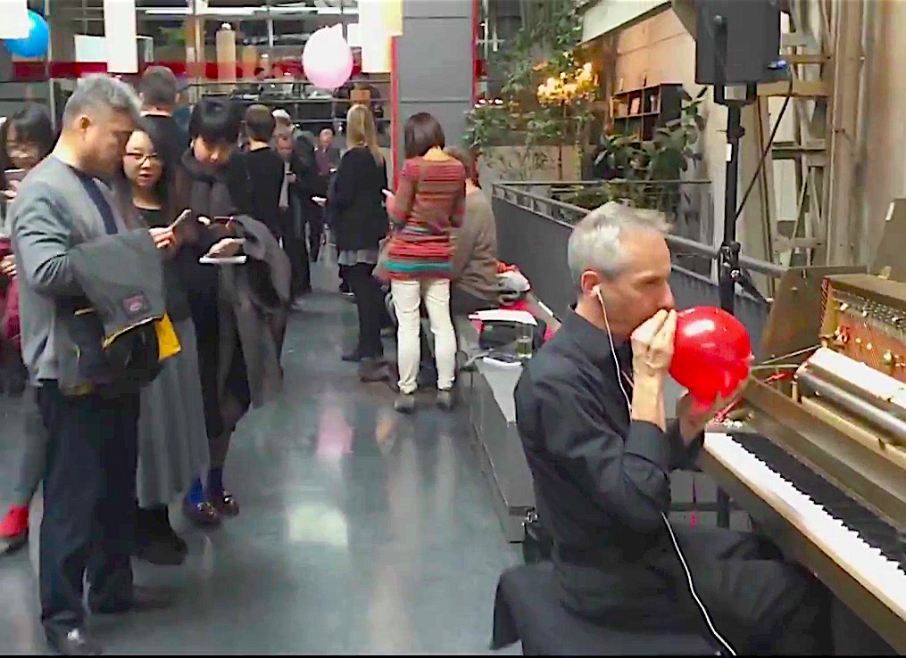 During the performance, the audience plays games – involving colored balloons – on their smartphones using a web application using a local Wi-Fi network. The games, as well the sounds they produce through the smartphone speakers, follow the participants’ orientation towards the musicians and change with the different parts of the composition. Some of the sounds appearing on the smartphones are controlled by an additional pianist interpreting a part of the score. The result of the game performance of all participants (i.e. the number of points associated to the balloons of different colors and to the four instruments) seem to determine the end of the performance.